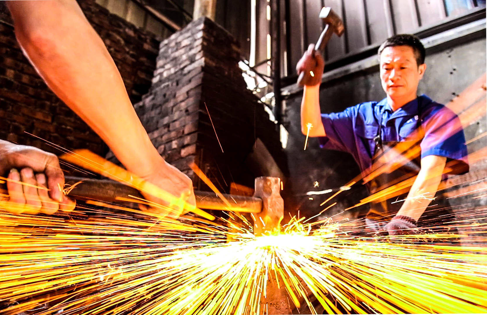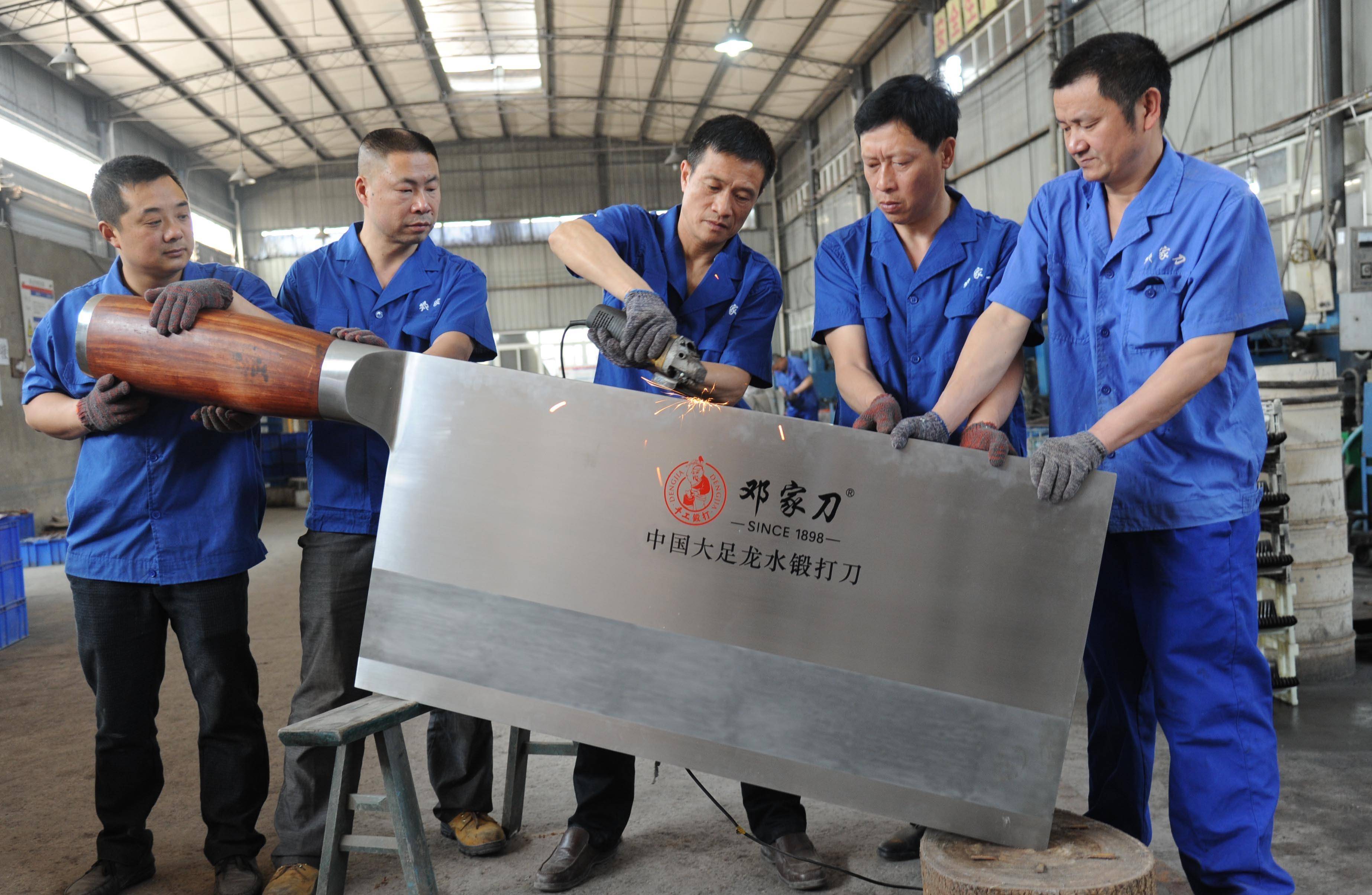大脚石刻开凿时,数以万计的石匠汇聚大脚,他们需要各类凿、锤、錾、斧等东西来雕琢坚硬的岩石。制做这些东西对锻制工艺要求极高,于是,一批特地为石刻工匠打制东西的铁匠正在龙水镇安了家,由此锻出了龙水五金财产的泉源。“铁锤可当响山涧,百炼匠具忙龙水”成为最早的市场写照。龙水五金,始于晚唐,兴于石刻,盛于烽火,淬于和平,一条火取铁的脉络正在大脚蜿蜒上千年。公元892年,唐代昌州刺史韦君靖为抵御黄巢的戎行,正在龙水设炉制兵。公元1258年,蒙军围合川,龙水“插刃凿子箭”令城头守军士气大振。明清“湖广填四川”,移平易近沿玉龙煤铁走廊而来,龙水构成“铁器十八行”,刀剪锁锄各守其坊,锻打身手正在师徒口口相授中固化成型。抗日和平期间,川军脚蹬芒鞋、背负大刀出川,大脚月产钢铁225吨,铁炉1200多座,匠人3400余名,邓氏族人及龙水多量工匠日夜锻制“爱国大刀”,随军到了豫、皖、苏、浙等15省疆场,2。7万余名大脚儿郎奔赴抗日火线,用铁取血写下“无川不成军”的壮烈注脚。一次次严沉汗青事务,刺激和帮推了大脚和刀、雕镂刀、刹刀、洋刀、大刀曲至现在百余个糊口刀具品种的降生、成长取繁荣。正在1200多年的世代传承和守正立异中,正在一代代坐商、行商的中,大脚龙水铸就了独具巴渝特色的“中国西部五金之都”“中国锻打刀剪核心”地位。